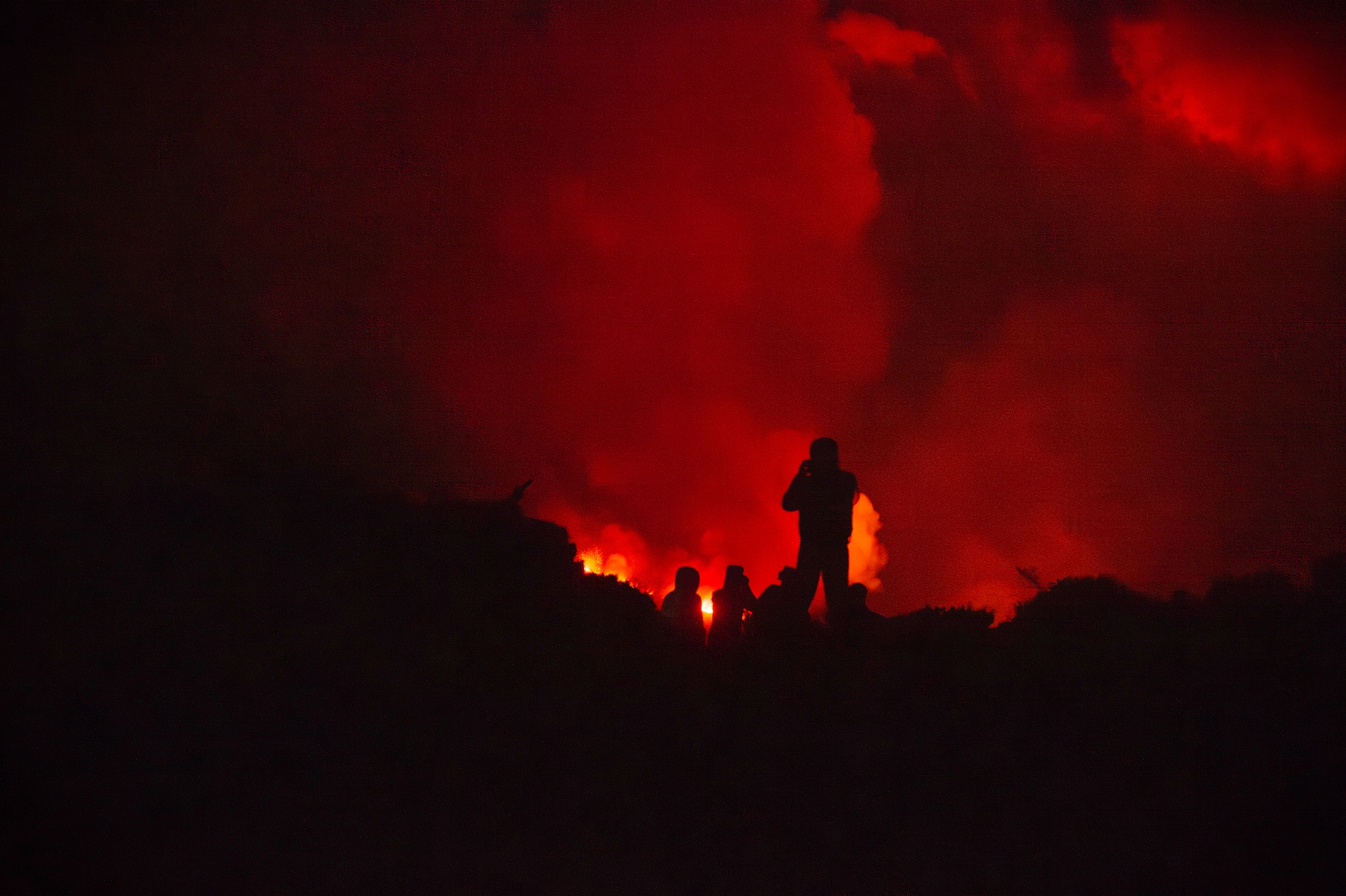 2026年2月15日,富爾奈斯火山噴發出的岩漿,順著斜坡緩緩向東流淌。(Richard Bouhet/AFP via Getty Images)