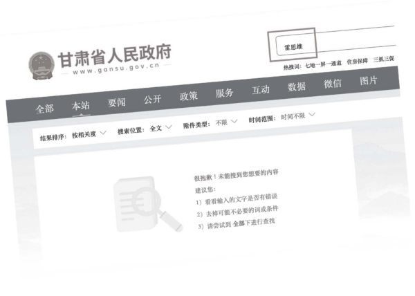 3月13日,甘肅政府官網的「省政府領導」一欄中,其「個人活動」報道列表已經被清空。在搜索欄搜索「雷思維」的名字,結果返回「很抱歉!未能搜到您想要的內容」。這與其他省政府官員不同。