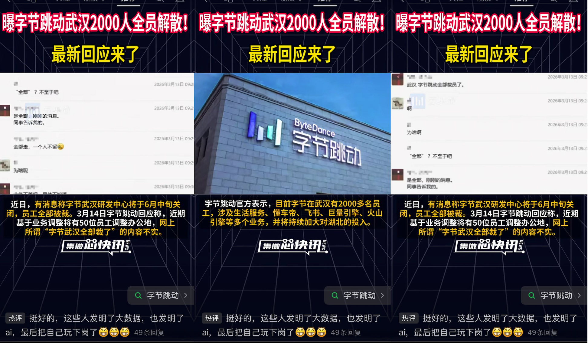 字節跳動於3月14日回應稱「傳言不實」,並表示僅有約50人因業務調整改變辦公地點。但市場對這一說法仍存疑。微信網民「葉飄零」留言稱:「我同事老婆是字節跳動的,去年年底整個部門直接取消。」另有說法稱,公司對被裁員工給予一定補償。