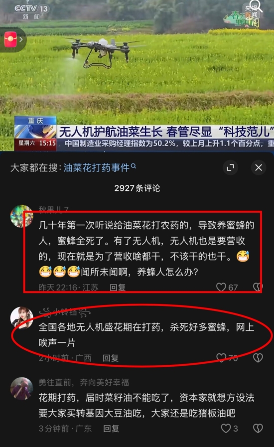 張愛民與劉保國均表示,今年的無人機噴藥規模在歷年從未有過,「往年可能有1%左右的養蜂的會反映有些地方中毒」,今年卻是成片爆發。兩人已決定明年不再追油菜,「如果我們養蜜蜂的全部都不去採油菜花的話,油菜花就很難收種子。」