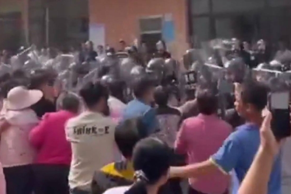 現場片段顯示,大批手持盾牌的防暴警察在村委會門前排成一排,與村民形成對峙狀態,最終現場變得一片混亂,防暴警察用盾牌推搡村民,村民徒手抵抗,雙方一度激烈衝突。