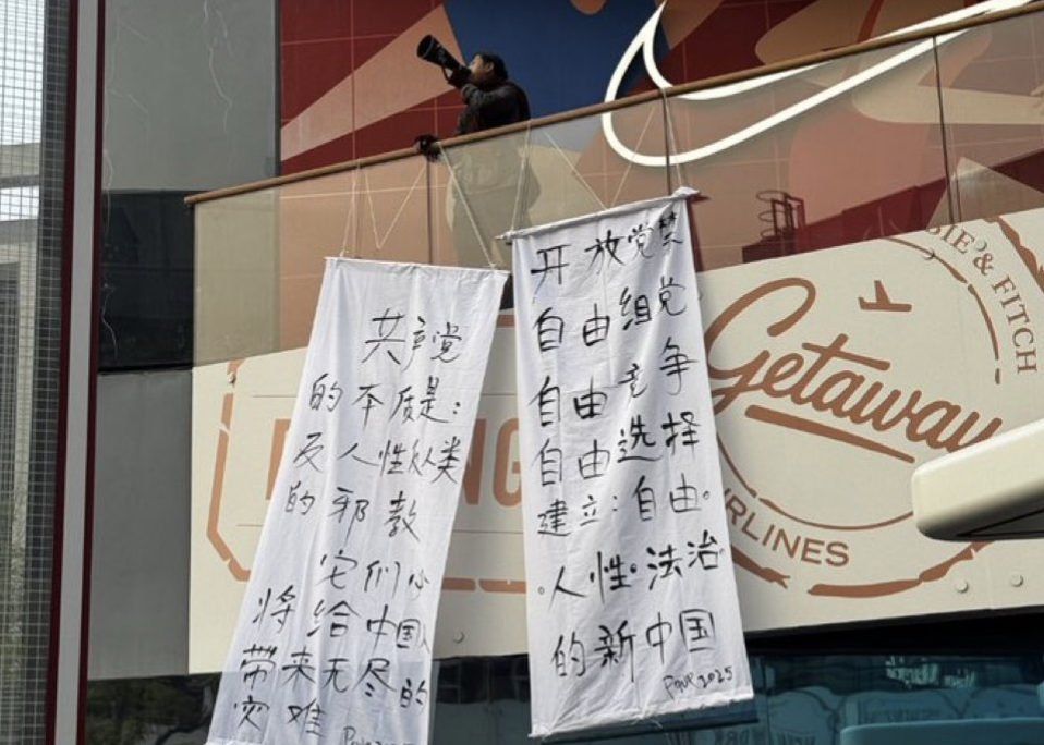 2025年10月25日,北京三里屯街頭曾有人掛起兩面反共直幡,標語內容直指中共是反人類的邪教。但當時只有照片曝光,周三(3月18日),事發時的影片在海外網上流出。