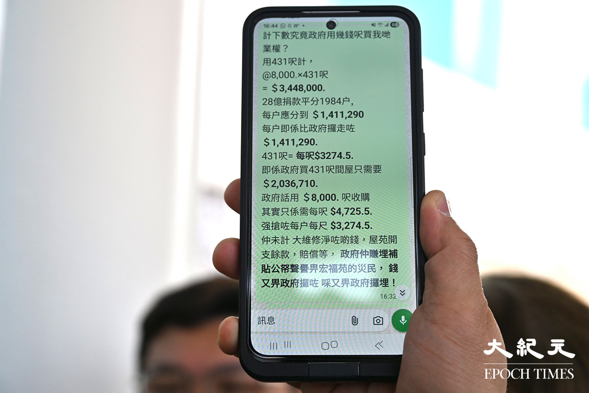 宏昌閣李先生對政府收購計劃的補償安排提出質疑,指當局公布的每呎8千元收購價並非真實數字,實際上政府每戶平均只出資約4千多元,餘下部份來自社會捐款。他更批評,政府把捐款與公帑混同處理,等同「食咗」廿多億元捐款。