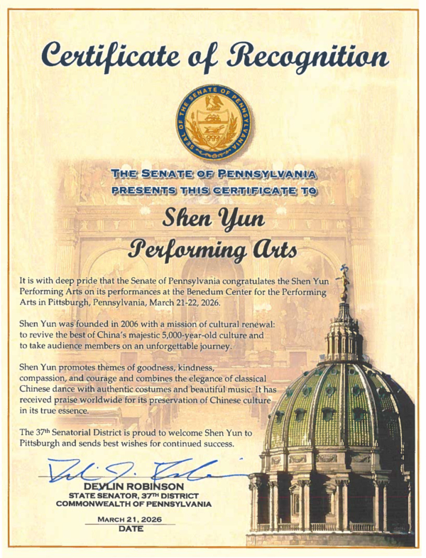 羅賓遜參議員在褒獎中寫道:「賓夕凡尼亞州參議院懷著無比自豪的心情,向神韻藝術團致以誠摯的祝賀,祝賀其於2026年3月21日至22日在賓夕凡尼亞州匹茲堡市本尼德表演藝術中心的演出圓滿成功。」