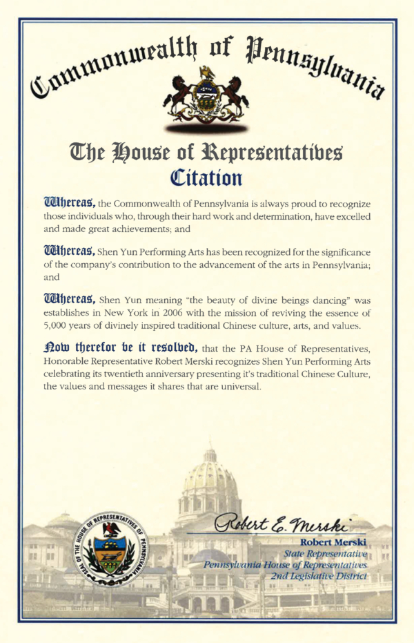 梅爾斯基眾議員在褒獎狀中寫到,「賓夕凡尼亞州始終以表彰那些憑藉辛勤工作和毅力取得卓越成就的個人而自豪。神韻藝術團因對賓夕凡尼亞州藝術發展的重要貢獻而獲得表彰。」