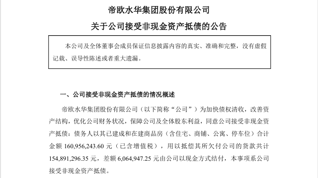 21日,帝歐水華在發表的《關於公司接受非現金資產抵債的公告》中表示,「同意公司接受非現金資產抵債:債務人以其已建成和在建商品房(含住宅、商舖、公寓、停車位)合計金額160,956,243.60元(已含增值稅),用以抵償其所欠付公司的貨款共計154,891,296.35元,差額6,064,947.25元由公司以現金方式結付。」