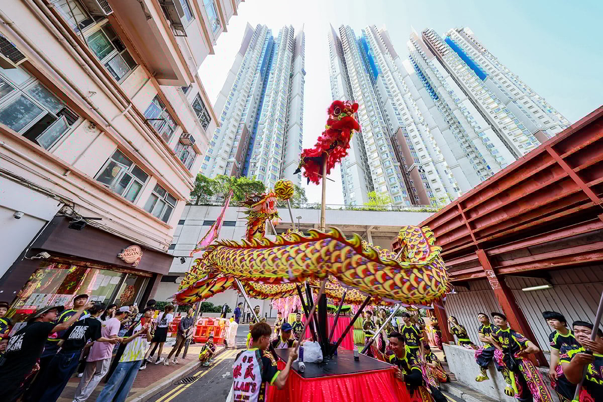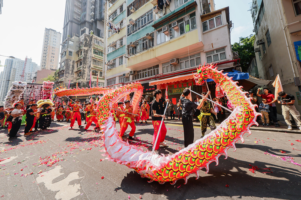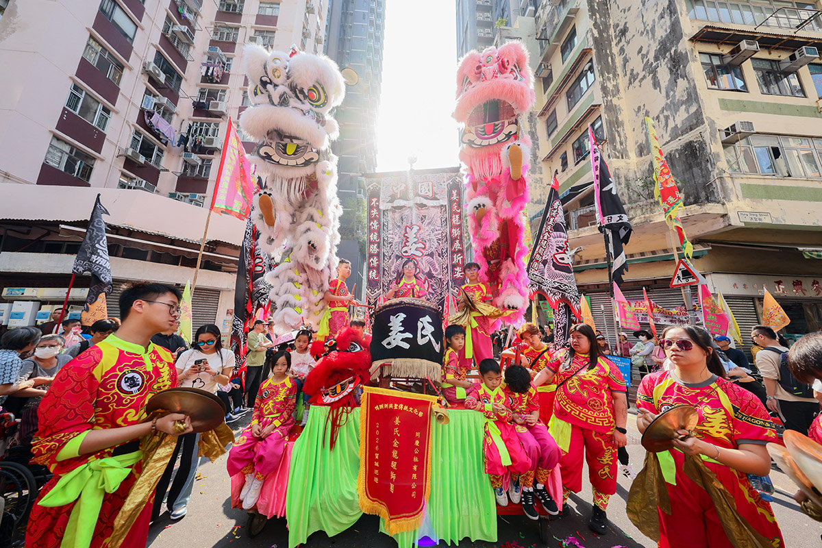 下午則舉行賀誕巡遊,有16支巡遊隊伍、超過800人參與。隊伍穿梭鴨脷洲大街,並配合醒獅採青表演,將象徵吉祥的生菜向四周派發,寓意「生財有道」。整體氣氛熱鬧,不少途人駐足觀看及拍照。