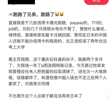 據社交媒體披露,一名來自重慶的中國留學生,在離開日本前密集申請多張信用卡,包括PayPay、7-Eleven及JCB等機構發行的卡片,並在出境前將其全部刷爆套現,同時拖欠數月房租及水電費,隨後註銷日本簽證,悄然回國避債。