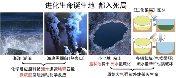 但是這都是不懂化學的進化論專家的幻想。為甚麼化學實驗要在試管、燒瓶裏進行?因為封閉的小空間,能維持底物(原料)的高濃度。較高的底物濃度,才能推進化學反應。而水,特別是活水,會迅速分散底物,讓化學反應迅速終止(原材料稀釋沒了)。而且,很多生物大分子的形成需要「乾燥-注水」循環:乾燥能讓兩個分子之間縮去一個水份子,連接成較大的分子,注水是讓生物分子活起來。所以,「不能乾燥的」活水環境,都無法產生原始生命。