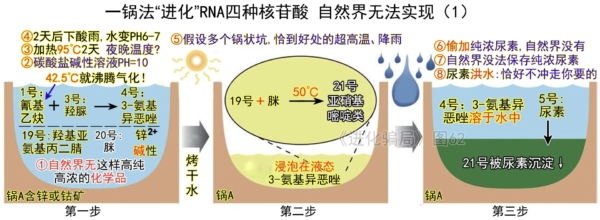 假設7:假設A鍋有高純高濃的1號(氰基乙炔)、3號(羥脲)、19號(羥基亞氨基丙二腈)、20號(脒)四種化合物——雖然米勒實驗能產生這些,但都是少量、微量,混有太多雜質,無法純化的。他們調包,用的都是人工合成的這些,自然界沒有這麼高純高濃度的東西。
