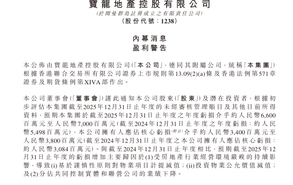寶龍地產23日發布了《內幕消息盈利警告》公告。公告表示:初步評估「預期本集團於截至2025年12月31日止年度之年度虧損介乎約人民幣6,600百萬元至人民幣7,000百萬元(截至2024年12月31日止年度之年度虧損:約人民幣5,498百萬元),本公司擁有人應佔核心虧損介乎約人民幣3,400百萬元至人民幣3,800百萬元(截至2024年12月31日止年度之本公司擁有人應佔核心虧損:約人民幣3,084百萬元)。」顯示出,相比2024年虧損額度均在增加。