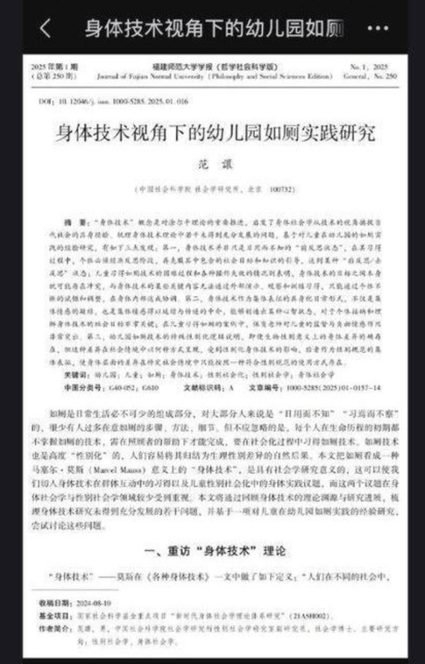據大陸新京報報道,此文章題為《身體技術視角下的幼兒園如廁實踐研究》,該論文於2025年1月發表在福建師範大學學報(哲學社會科學版),作者范譞是中國社會科學院社會學研究所性別社會學研究室的副研究員。論文中詳細描述了男女童如廁時的具體姿勢與過程。范譞在論文中提到,2016年至2020年間,他在北京、甘肅、河北、廣西多地幼兒園進行了53次田野觀察,累計形成觀察筆記約30萬字。