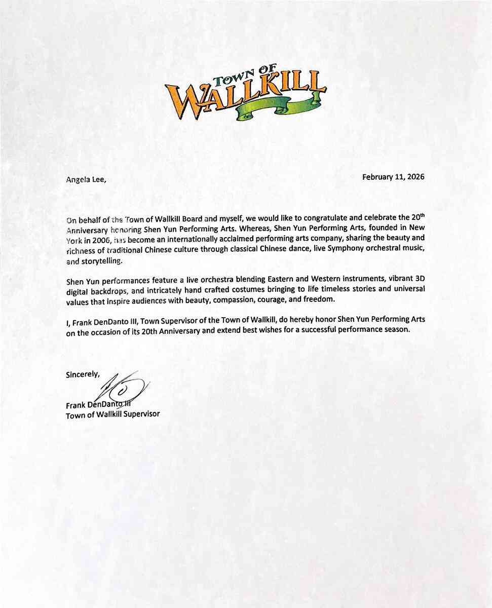 橙縣沃基爾鎮(Wallkill)鎮長Frank DenDanto III亦代表鎮董事會,向神韻致上誠摯祝賀,共同慶祝神韻藝術團成立二十周年,並預祝本季在林肯中心的演出圓滿成功。