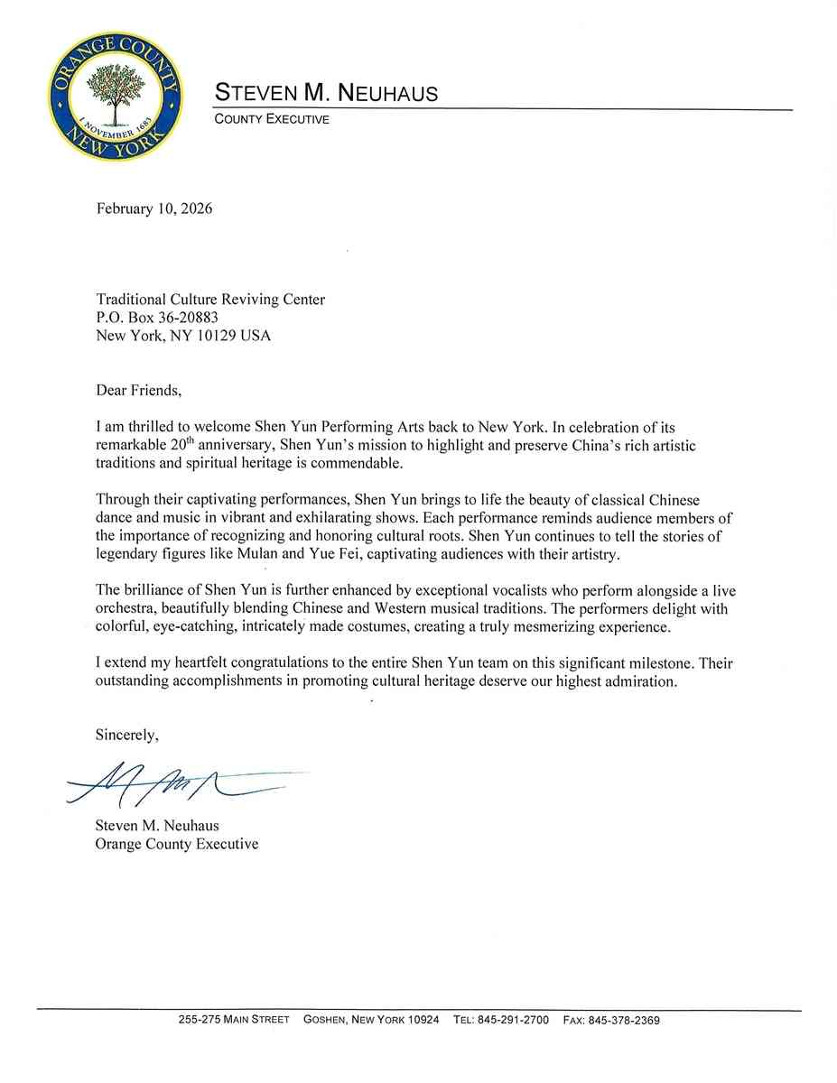 Neuhaus在「縣長褒獎公告」中寫道:「神韻藝術團二十年前創立,以復興並傳播五千年中華傳統文化的美麗、智慧與道德價值為使命。」「自創立以來,神韻已發展成為享譽全球的古典中國舞與音樂團體,以卓越的藝術造詣、原創管弦樂作品及震撼人心的演出征服了各大洲的觀眾。」