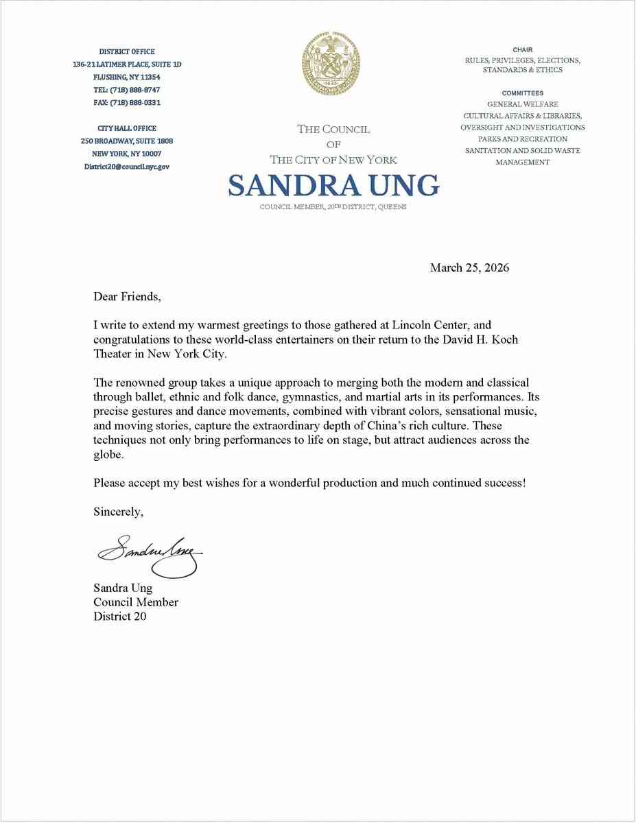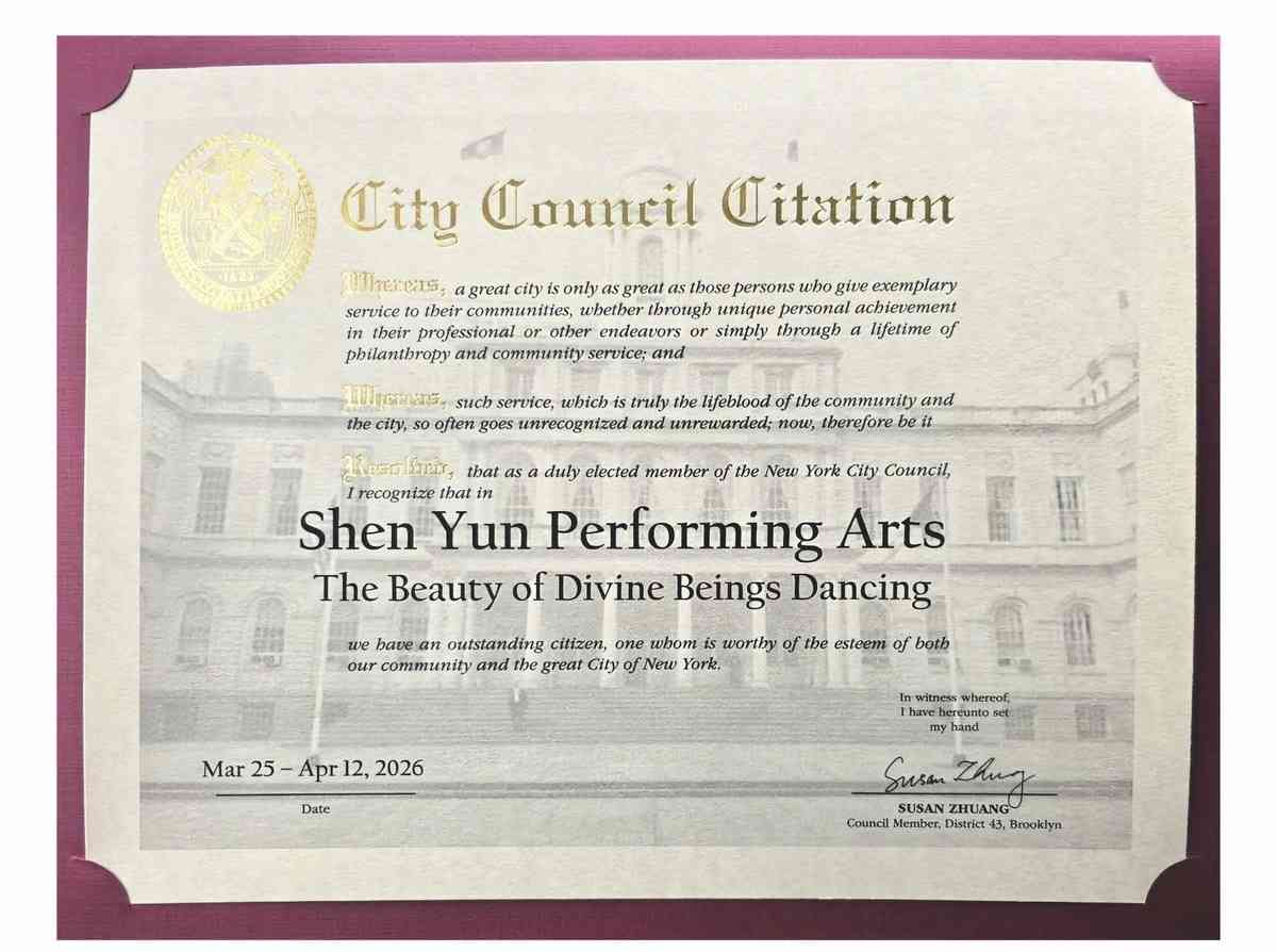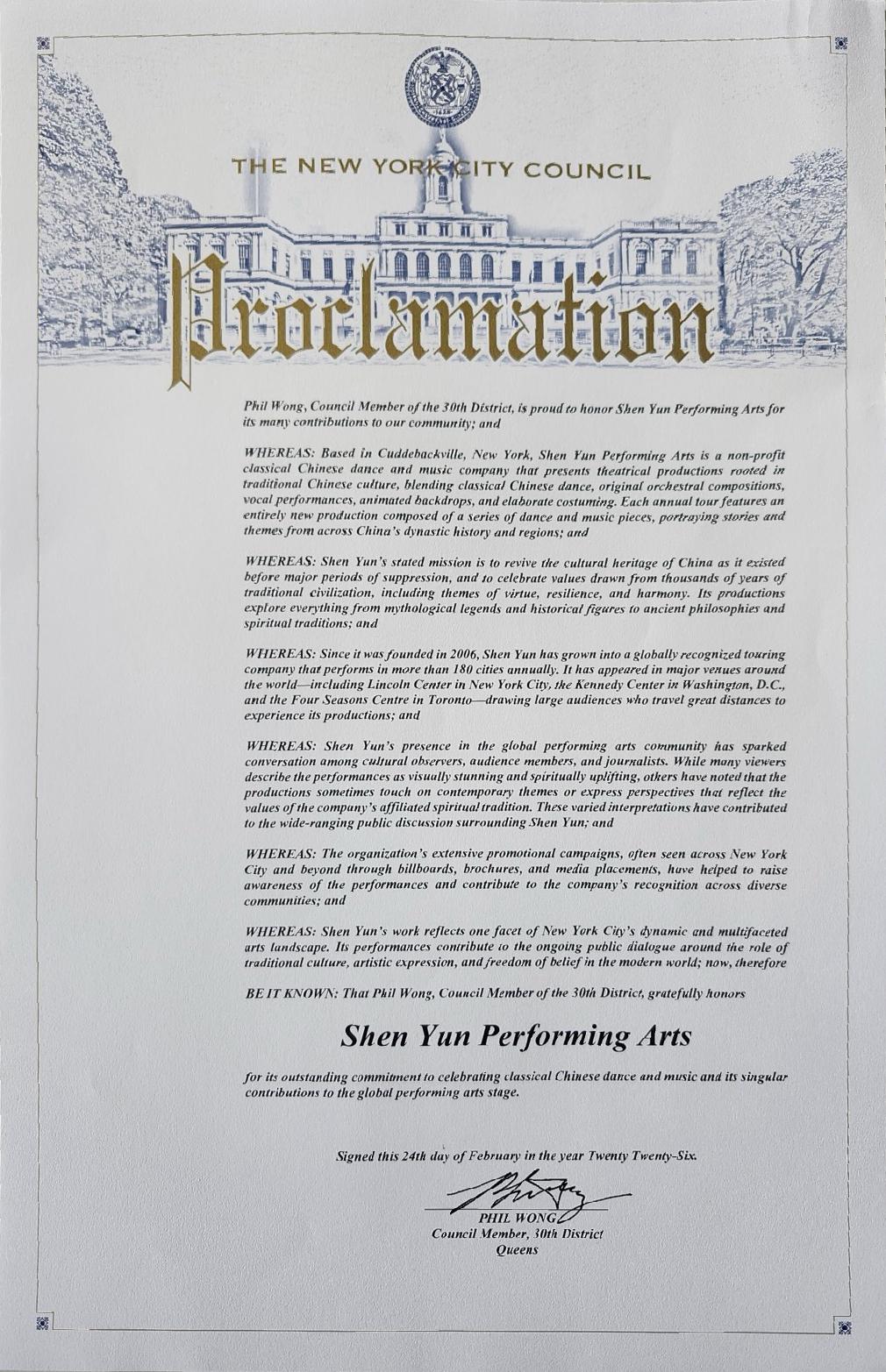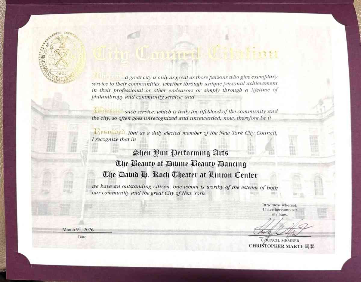 「因此,茲決議,作為紐約市議會的正式當選成員,我褒獎神韻藝術團在林肯中心大衛寇克劇院的演出展現神舞動之美,她值得我們社區和偉大紐約市的尊敬。」