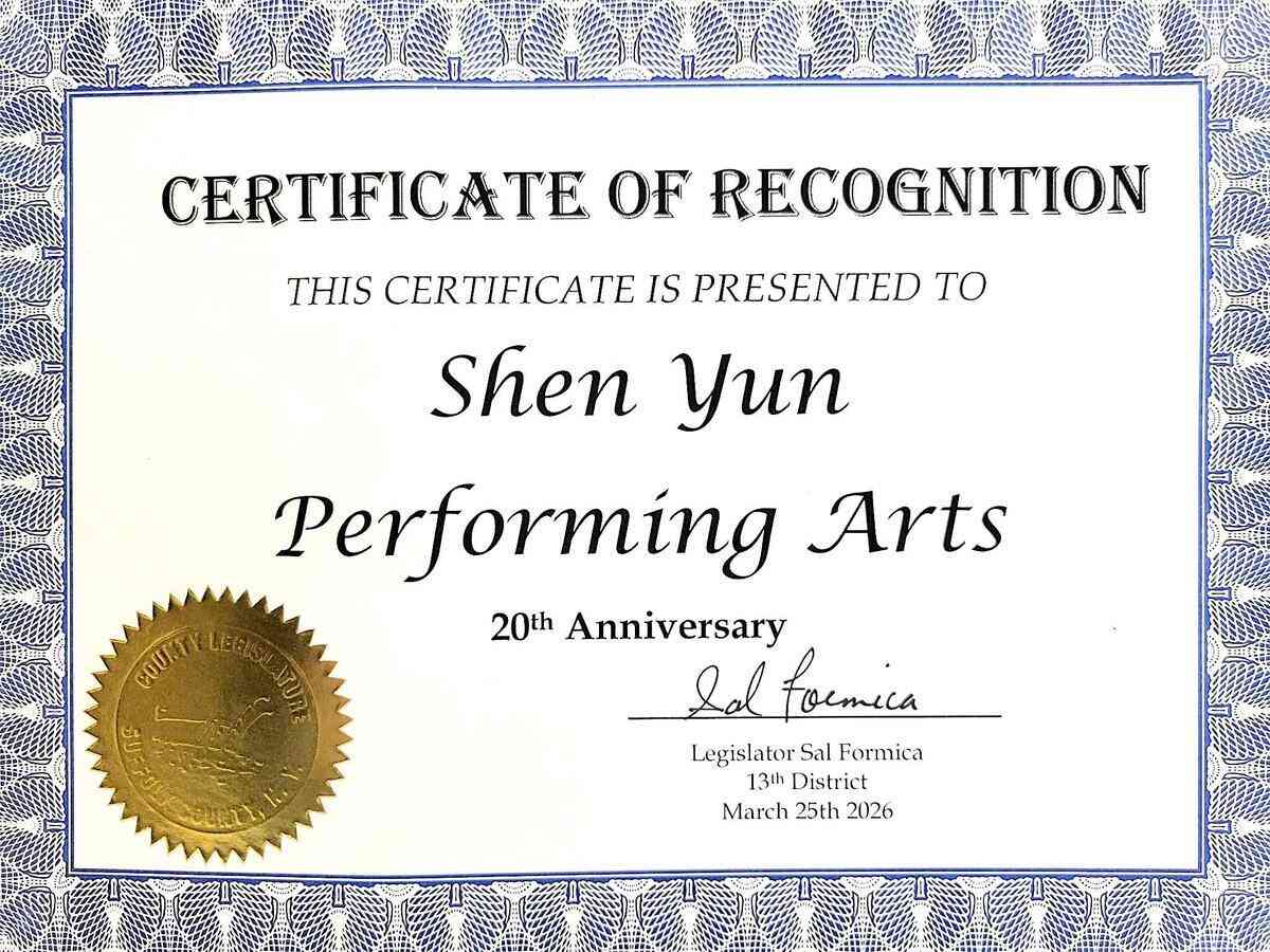 神韻創立20周年之際,薩福克縣(Suffolk County)第9選區議員Samuel Gonzalez和第13選區議員Sal Formica也分別向藝術團頒贈了褒獎狀。