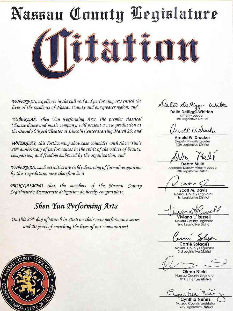 「鑑於此類活動極具價值,值得本議會予以正式表彰,特此宣告:拿騷縣議會民主黨團成員,謹祝賀神韻2026年3月25日帶來全新演出,及二十年來作出豐富社區生活的貢獻。」