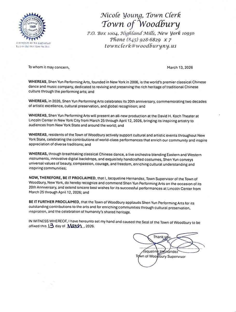 Hernandez表示:「特此於神韻藝術團成立二十周年之際,對其予以嘉許,衷心祝願其於2026年3月25日至4月12日在林肯中心的演出圓滿成功;並特此宣告,伍德伯里鎮讚揚神韻對藝術領域的傑出貢獻,以及透過文化傳承、啟迪人心與頌揚人類共同遺產,為社區注入豐沛活力。」#