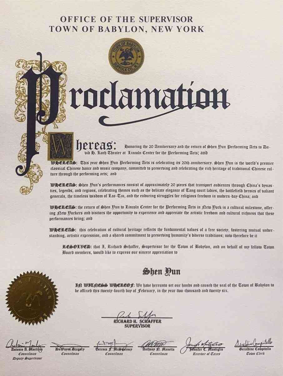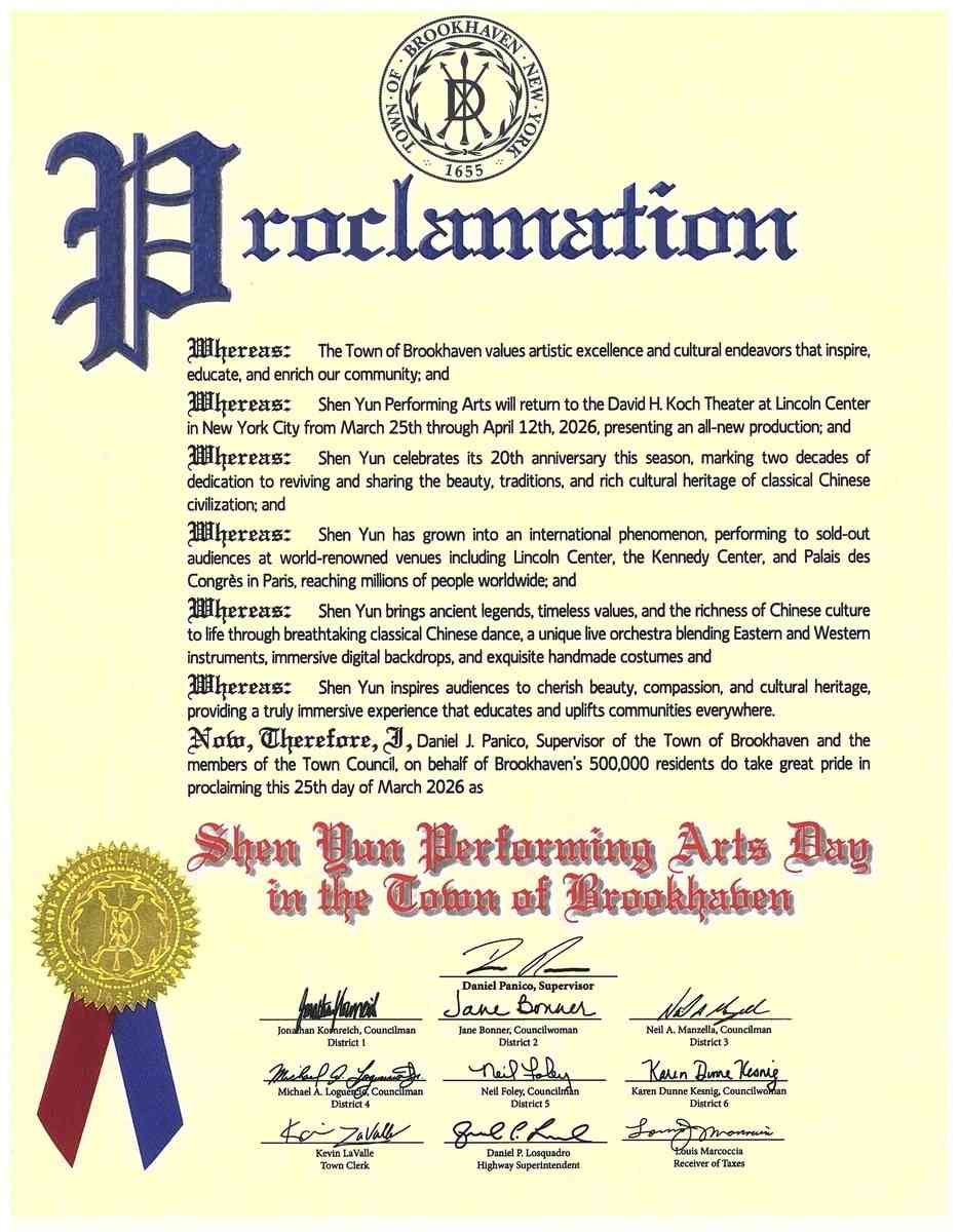布魯克黑文鎮(Brookhaven)鎮長Daniel Panico攜所有鎮政府官員簽署褒獎狀,宣布神韻在林肯中心上演的3月25日為「布魯克黑文鎮神韻日」(Shen Yun Performing Arts Day in the Town of Brookhaven)。他們讚美神韻「激勵觀眾珍視美、慈悲與文化遺產,提供真正沉浸式的體驗,教育並提升了各地社區」。聯署官員包括第1至第6選區鎮議員Jonathan Kornreich、Jane Bonner、Neil A. Manzella、Michael Loguercio、Neil Fole和Karen Dunne Kesnig等。