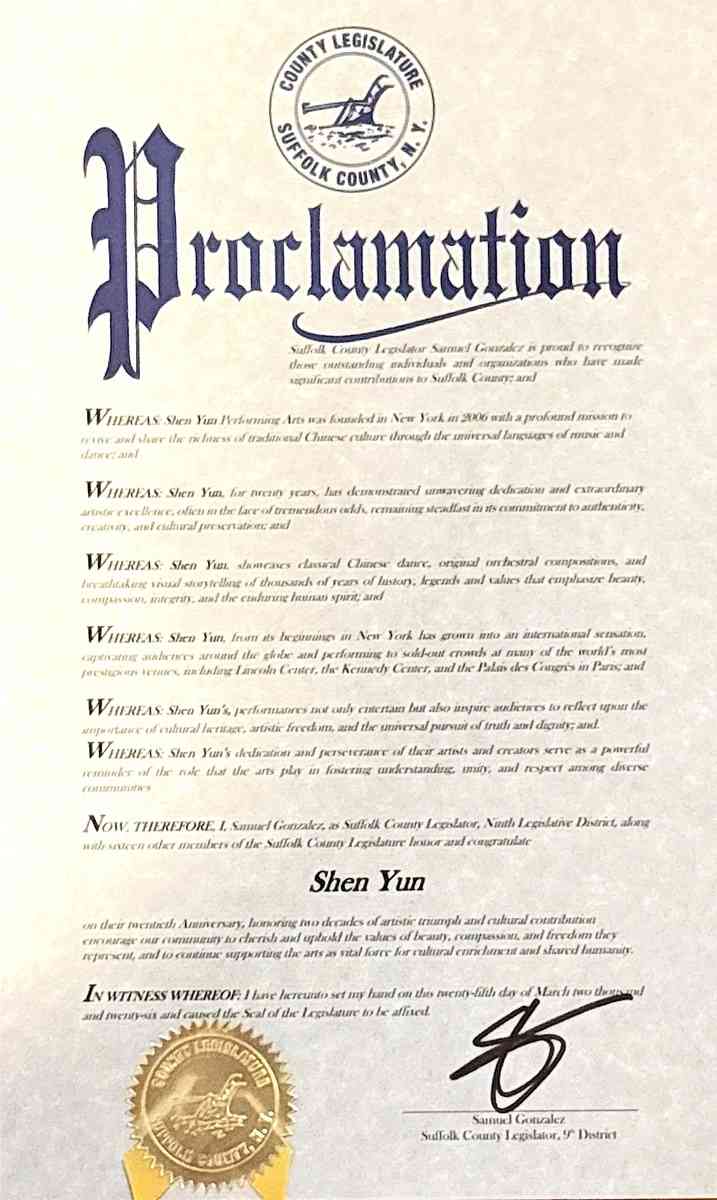 身為薩福克縣第9選區議員,Gonzalez聯同縣議會其他十六位成員,向神韻致以崇高敬意與誠摯祝賀,「並鼓勵本社區珍視並恪守神韻所代表的『美、慈悲與自由』之價值,持續支持藝術成為豐富文化與凝聚人類共同情感的重要力量」。