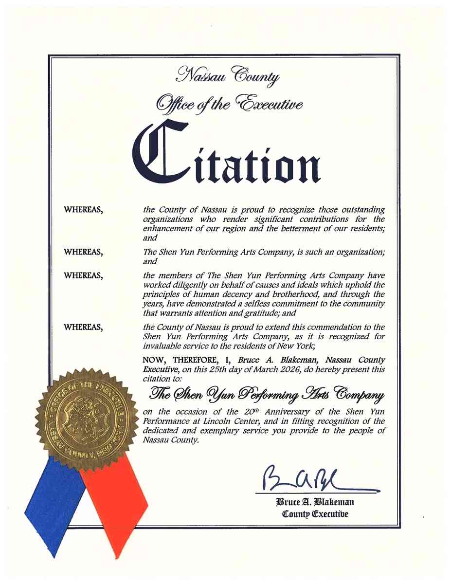 「拿騷縣很榮幸能褒獎那些為改善我們地區和居民的生活做出重大貢獻的傑出個人和組織。神韻藝術團就是這樣的一個機構。