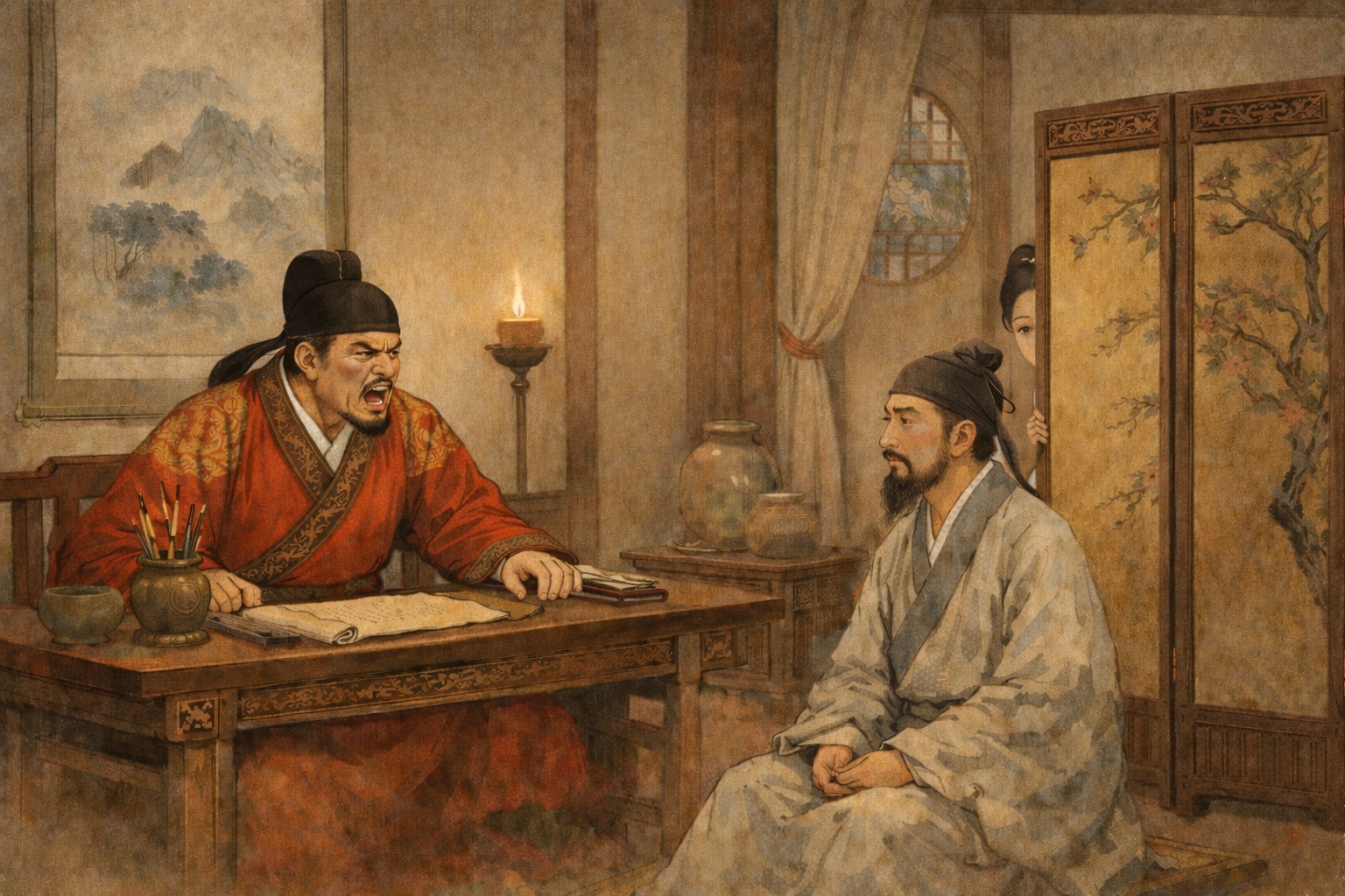 李翱聽了這些話語更加憤怒,立刻命人給他戴上鐐銬,關進牢獄。