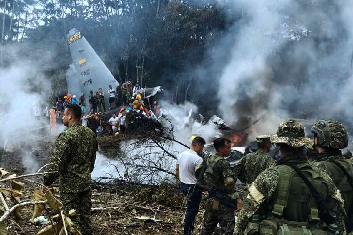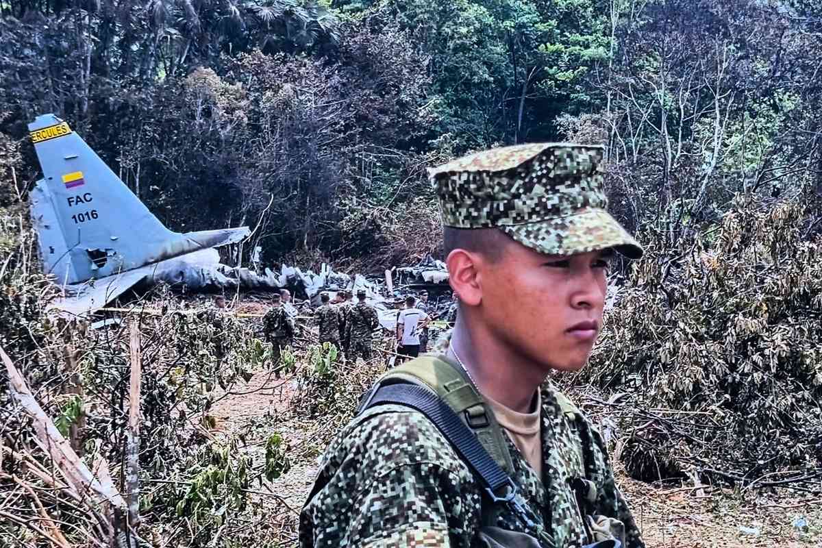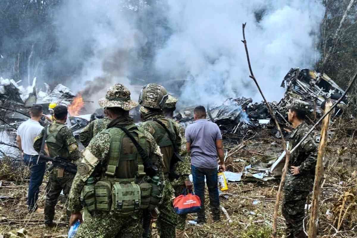 2026年3月23日,在哥倫比亞南部靠近厄瓜多爾邊境的萊吉薩莫港(Puerto Leguizamo),一架空軍C-130「大力神」運輸機在起飛過程中墜毀,民眾和士兵站在飛機殘骸旁。(Daniel Ortiz/AFP via Getty Images)