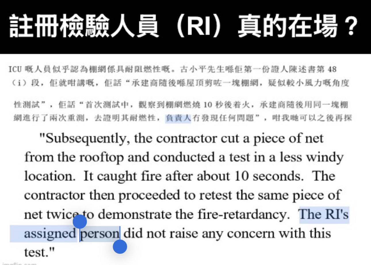 「ICU嘅古小平先生提供嘅證據就講出佢當時同劉小姐、同李先生進行咗簡單嘅測試,用打火機燃燒棚網,包括新批未開封嘅棚網卷以及兩個舊嘅樣本,分別喺一座次大廈同一座易取位置及另一座屋頂,佢哋話『測試結果並冇特別問題』,咁我諗委員會知道點解當日嘅測試冇問題啦。」