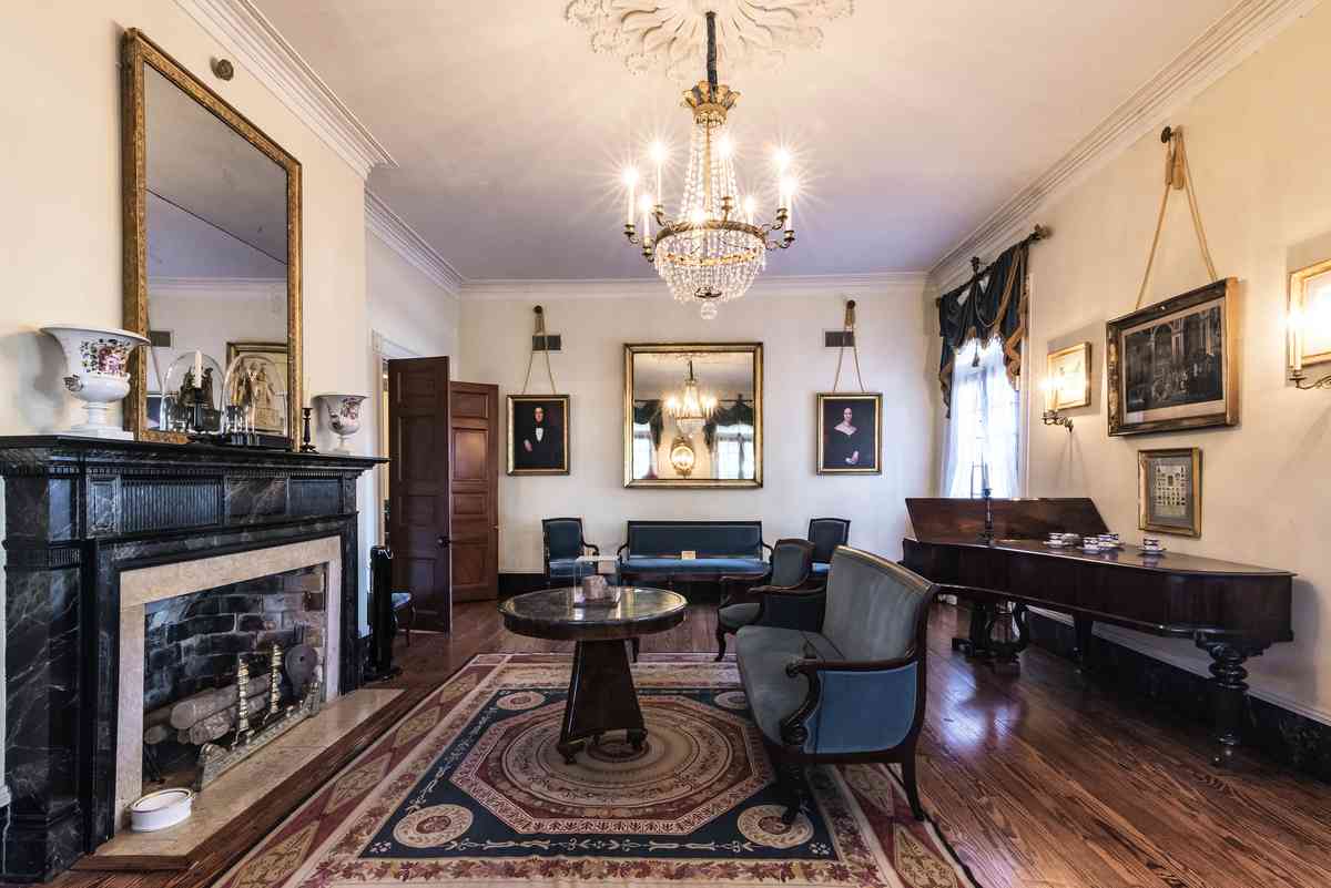 從大宅入口處推開柏木鑲板門,便來到了客廳。天花板上飾有大型裝飾徽章,其間裝點著精緻的枝形吊燈;燈具由水晶和黃銅製成,配有環形燭台,是客廳的視覺焦點。地板鋪設著拋光的老松木(heart pine)地板,壁爐架則漆成黑白大理石紋理。室內陳設著藍色天鵝絨法式座椅,屬於法王查理十世(1824—1830年在位)與路易-腓力(1830—1848年在位)時期風格。