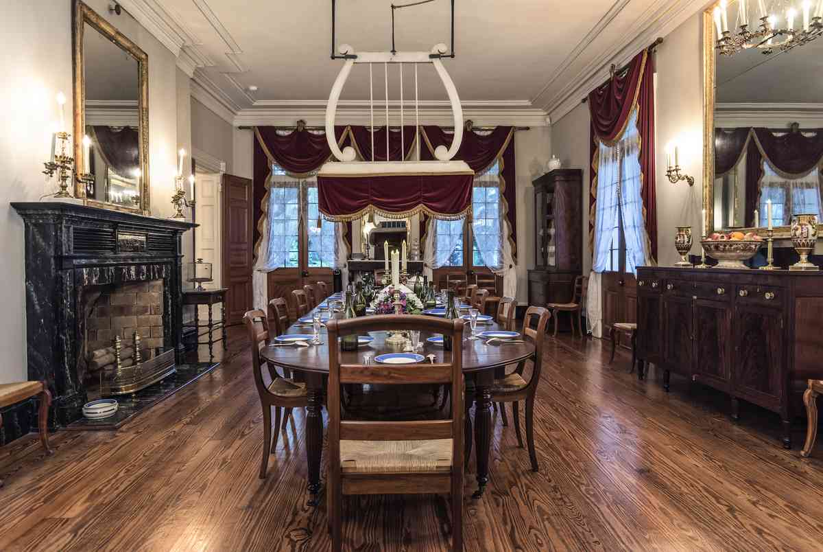 進入莊園餐廳,餐桌上方懸掛著的「驅蠅扇」(shoo-fly fan)是老宅的原物。這種設計獨特、形似豎琴的手動吊扇源自東印度——當地稱之為「朋卡」(punkah)。它的使用方法是,當人們在餐桌上用餐時,由僕人(南北戰爭前通常是奴隸)拉動繩索,使扇子緩緩地來回擺動。輕柔的氣流既可以驅趕蒼蠅,又能在南方炎熱的夏日帶來一絲涼意。深紅色的天鵝絨窗簾飾有金色流蘇,垂掛在「模壓疊層吊頂」(凹陷式天花板)之下的高窗前,顯得莊重氣派。