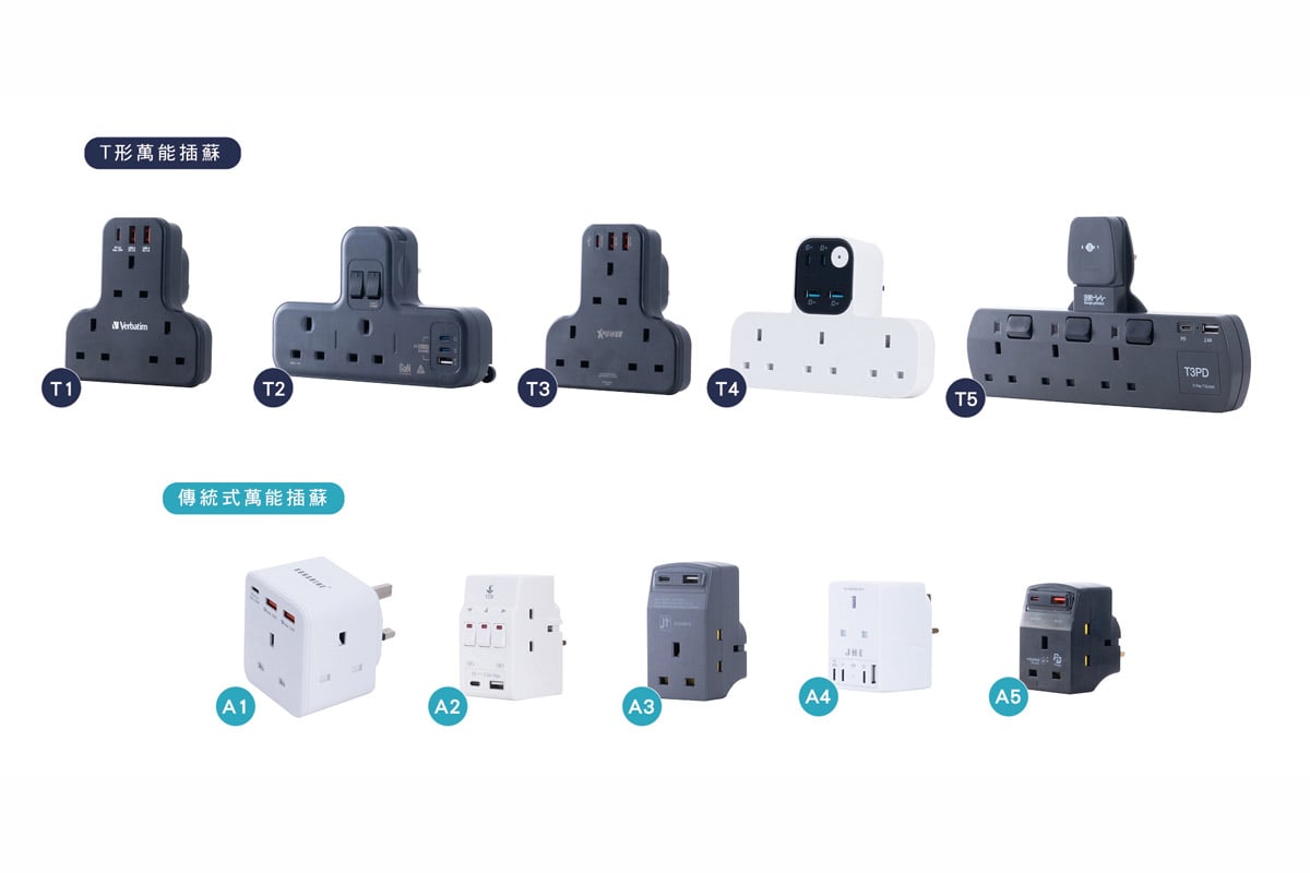 是次測試的10款均配備USB插座的萬能插蘇(或稱適配接頭),分為「傳統式」及「T 形」兩大類別。傳統式樣本的正面插座上方或下方設有2至4個USB插座,售價介乎$99至$148。T形樣本的機身則較薄,不少為條形設計,機身上方配備13安培(A)方腳插頭,同樣設有2至4個USB插座。樣本插入牆身電源插座後,機身呈倒T形,售價為$138至$189。所有樣本均提供2或3個13A三方腳插座。