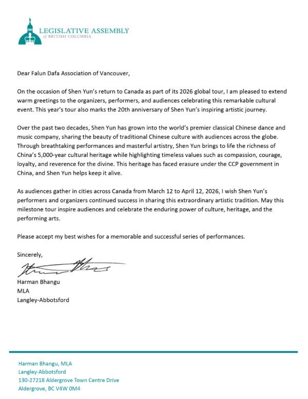 蘭里—阿伯茨福德選區省議員班古(Harman Bhangu)在賀信中寫道:「今年的巡迴演出也標誌著神韻啟迪人心的藝術旅程迎來二十周年。