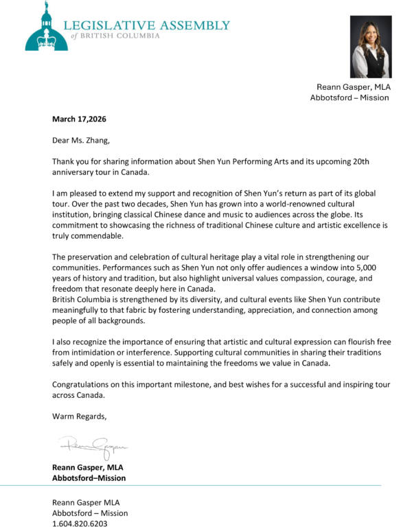 阿伯茨福德—米遜選區省議員加斯珀(Reanne Gasper)在賀信中表達對神韻在全球巡迴演出的支持與讚賞。「過去二十年來,神韻已成長為享譽世界的文化藝術團體。她將中國古典舞與音樂帶給了全球各地觀眾。其致力於展現中華傳統文化的深厚內涵與卓越藝術,實在令人欽佩。