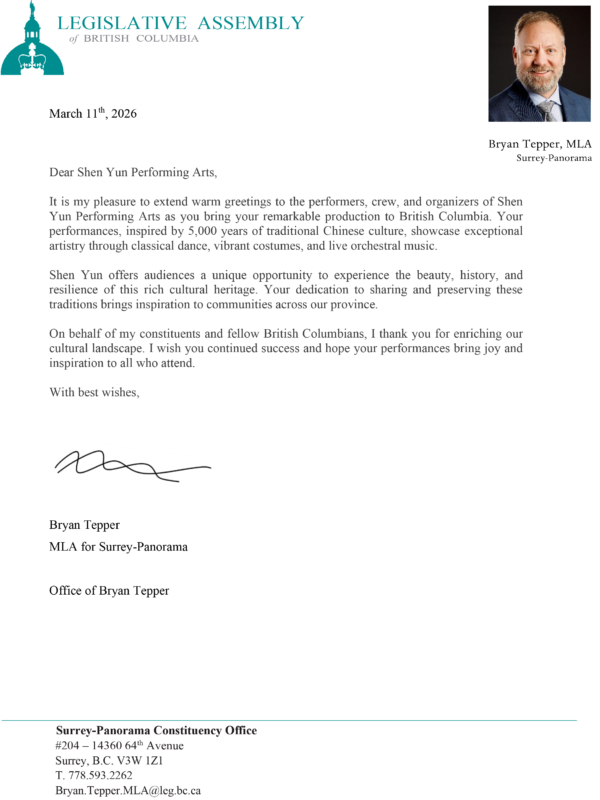素里—帕諾拉馬(Surrey-Panorama)選區省議員特珀(Bryan Tepper)在賀信中讚美道:「神韻演出以五千年中華傳統文化為底蘊,透過中國古典舞、華美服裝與現場樂團演奏,展現出卓越的藝術造詣。你們為觀眾提供了獨特而難得的機會,讓人得以領略這份豐厚文化傳統之美,並感受其悠久歷史與堅韌精神。」