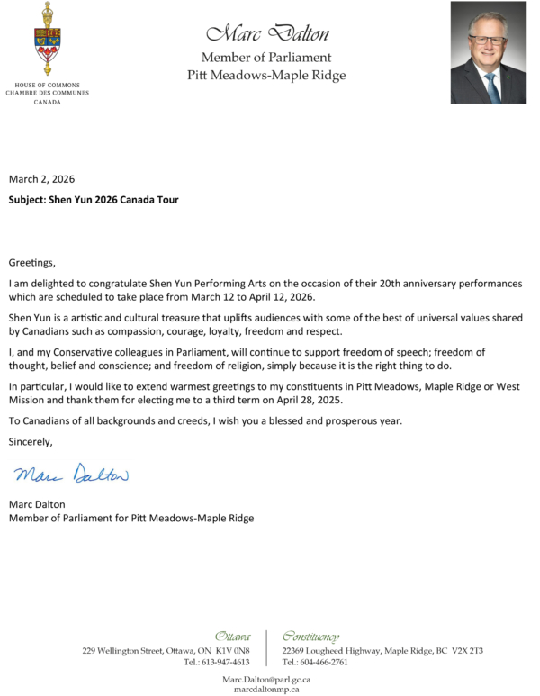 匹特草原—楓樹嶺—西米森選區國會議員道爾頓(Marc Dalton)在賀信中讚賞道:「神韻演出是藝術與文化的瑰寶。她展現善良、勇氣與忠誠,傳遞自由與尊重等加拿大人民珍視的普世價值,啟迪觀眾心靈,提升精神境界。