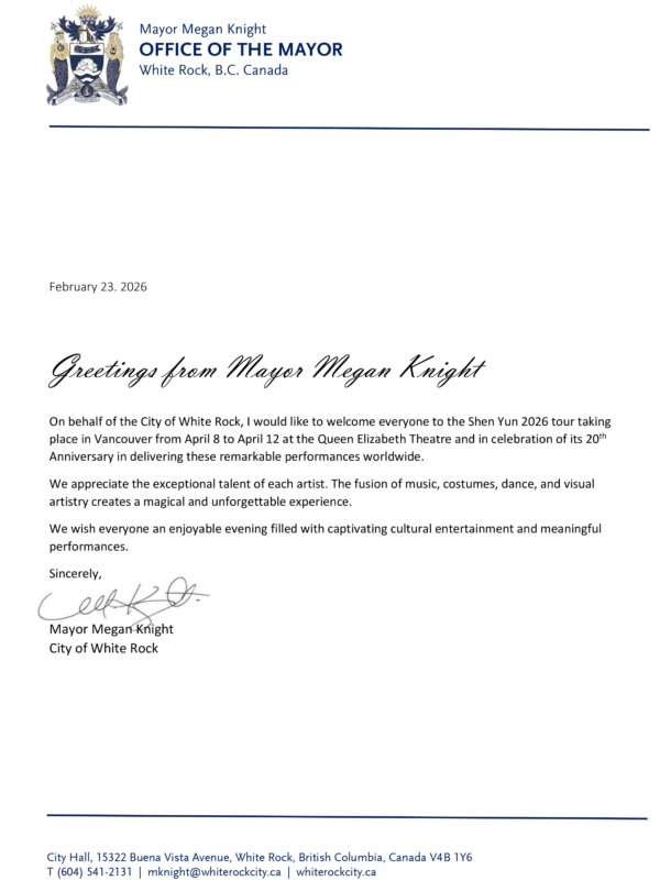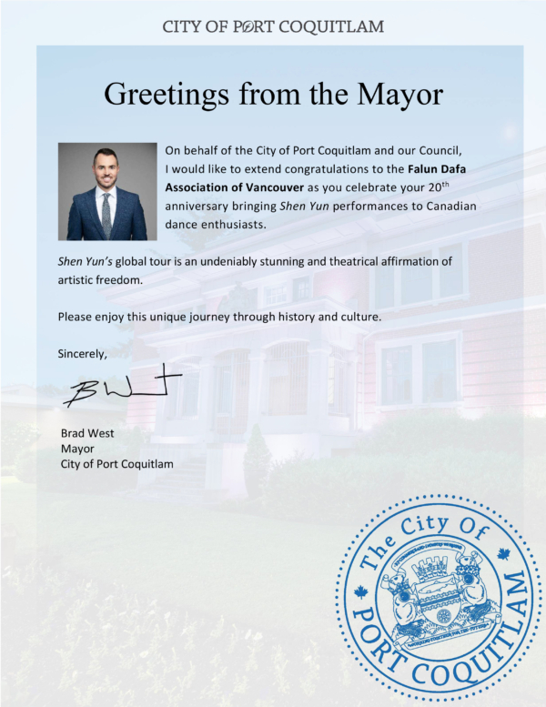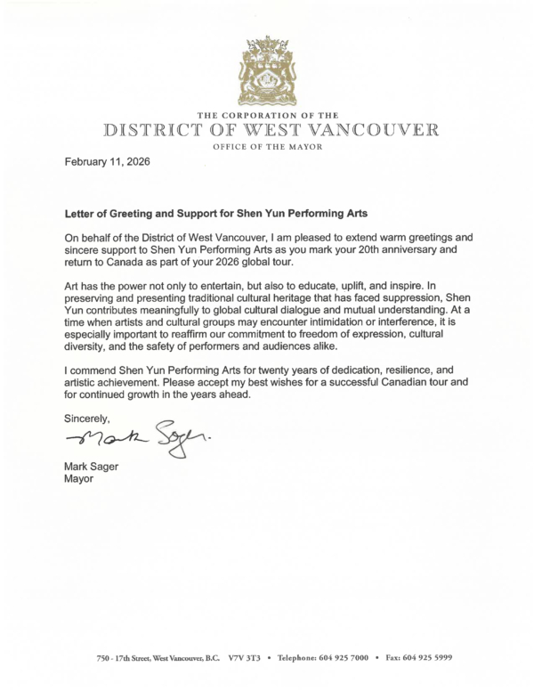 西溫哥華市長薩格(Mark Sager)在賀信中寫道:「藝術不僅具有娛樂的價值,也同樣擁有教育、提升與啟迪人心的力量。神韻藝術團在保護和展現遭受壓制的傳統文化方面,為全球文化對話與相互理解做出了重要貢獻。