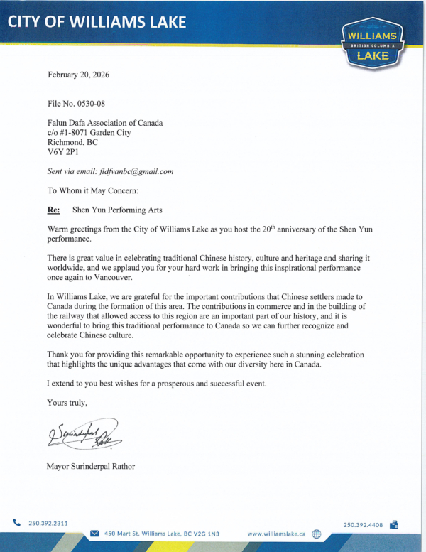威廉斯湖市長拉托爾(Surinderpal Rathor)在賀信中寫道:「弘揚中華悠久的歷史、文化與傳統,並傳播至世界各地,意義深遠。我們讚賞你們再次將這一鼓舞人心的演出帶到溫哥華所付出的辛勤努力。