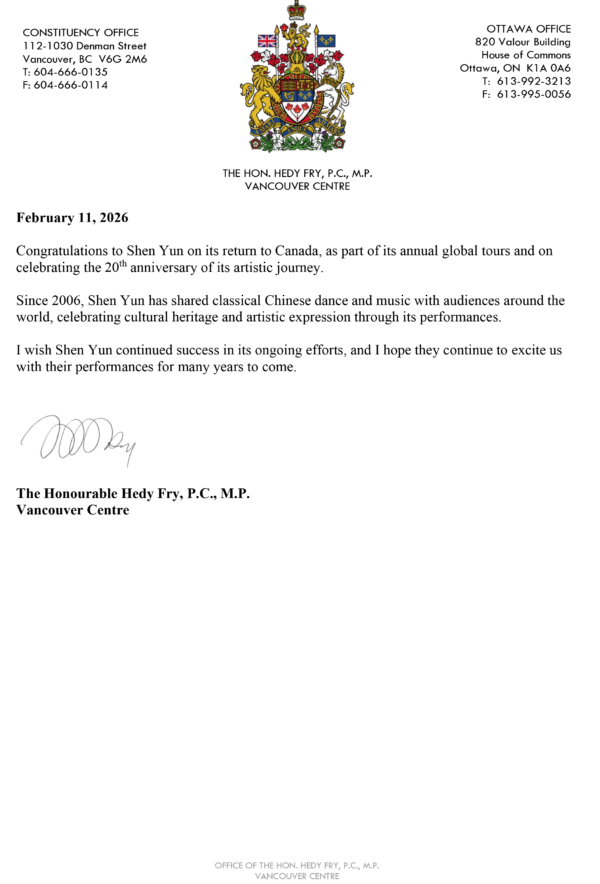 溫哥華中心選區國會議員、加拿大樞密院顧問(P.C.)費凱迪(Hedy Fry)向神韻藝術團發來賀信,歡迎神韻重返加拿大,並向神韻藝術團成立20周年表示祝賀。