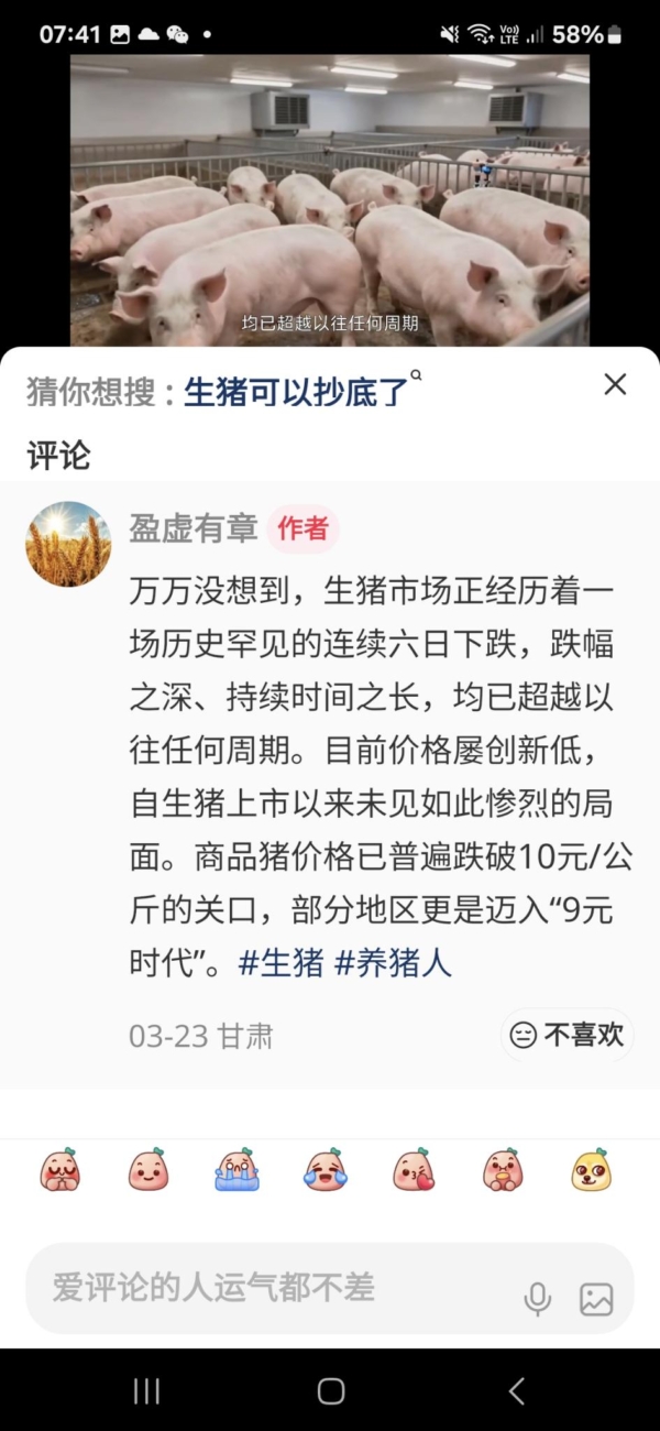 網民嘆道,「生豬市場正經歷一場歷史罕見的連續六日下跌,跌幅之深,持續時間之長,均已超過以往任何周期。」