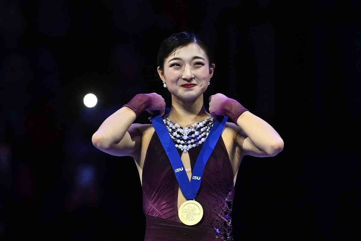 2026年3月27日,在捷克布拉格O2體育館,日本選手坂本花織在奪得女子單人溜冰項目冠軍後,在頒獎儀式上開心留影。(Michal Cizek/AFP via Getty Images)