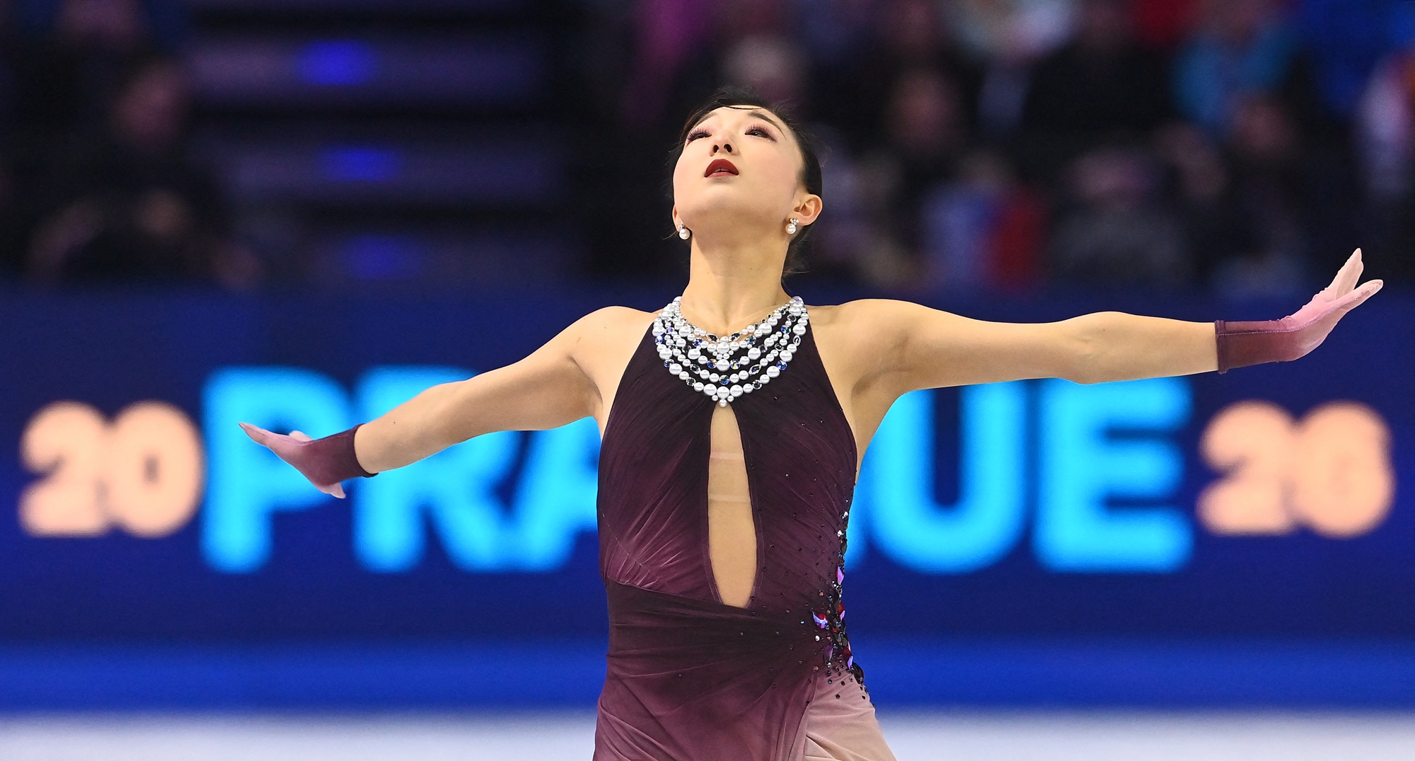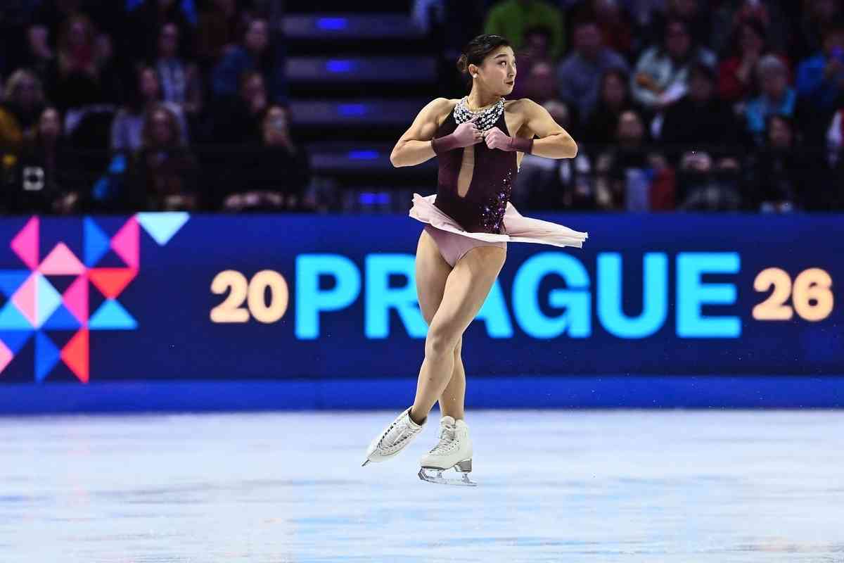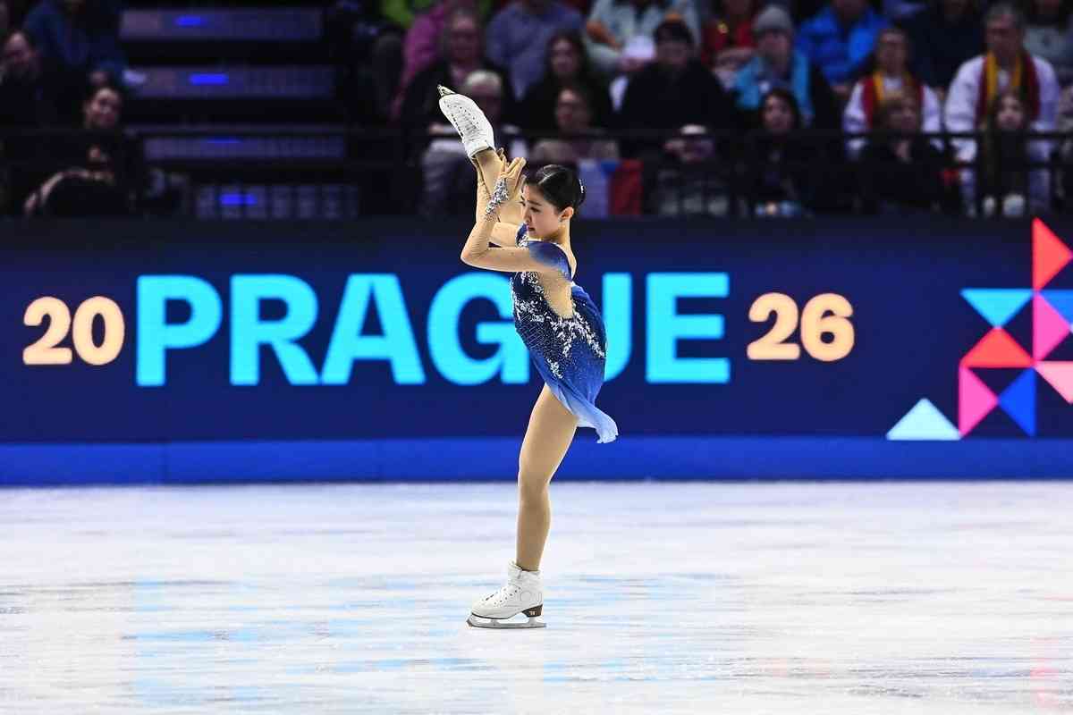 2026年3月27日,在捷克布拉格O2體育館,日本選手千葉百音參加女子單人滑自由滑決賽。(Michal Cizek/AFP via Getty Images)
