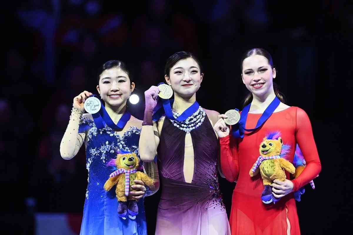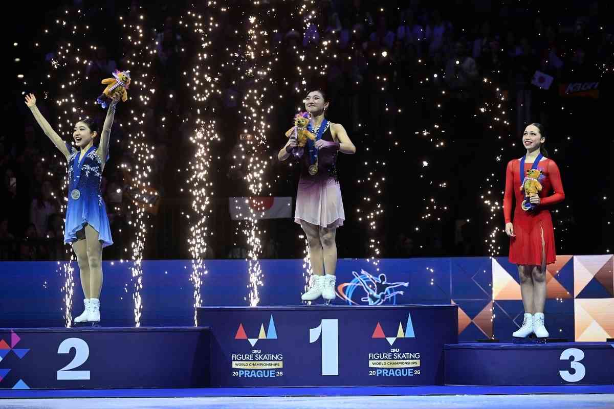2026年3月27日,在捷克布拉格O2體育館,女子單人滑金牌得主坂本花織(Kaori Sakamoto,中)、銀牌得主千葉百音(Mone Chiba,左)、銅牌得主平扎羅內(Nina Pinzarrone)在領獎台上合照留念。(Michal Cizek/AFP via Getty Images)