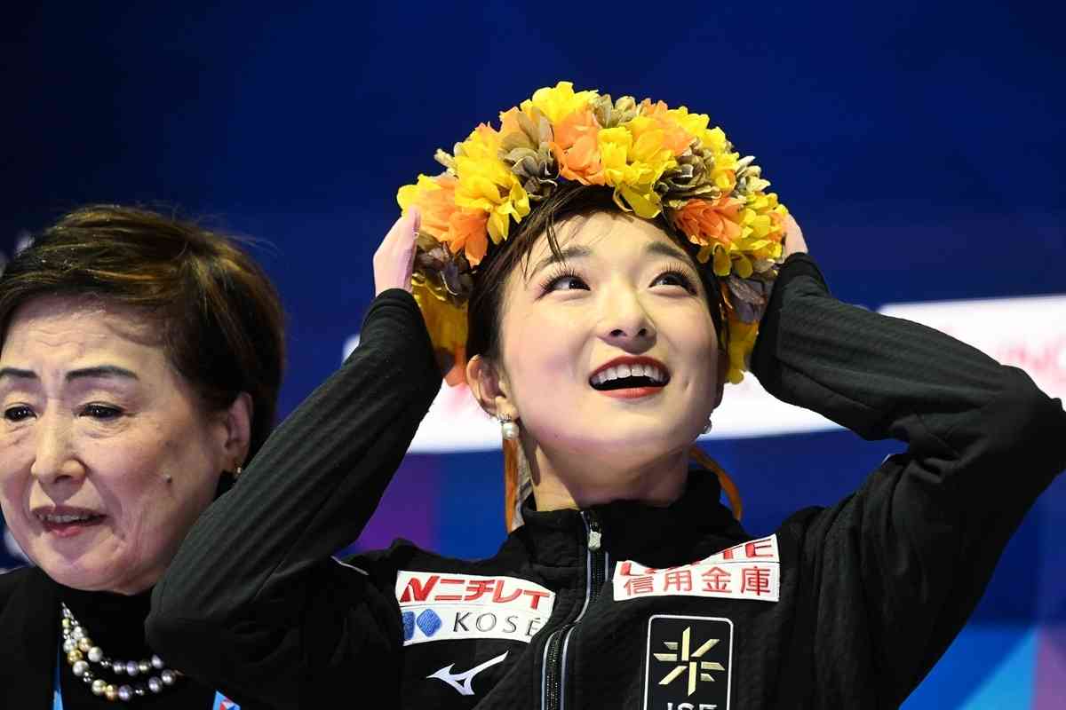 2026年3月27日,在捷克布拉格O2體育館,日本選手坂本花織在奪得女子單人滑項目冠軍後,在頒獎儀式上開心留影。(Michal Cizek/AFP via Getty Images)