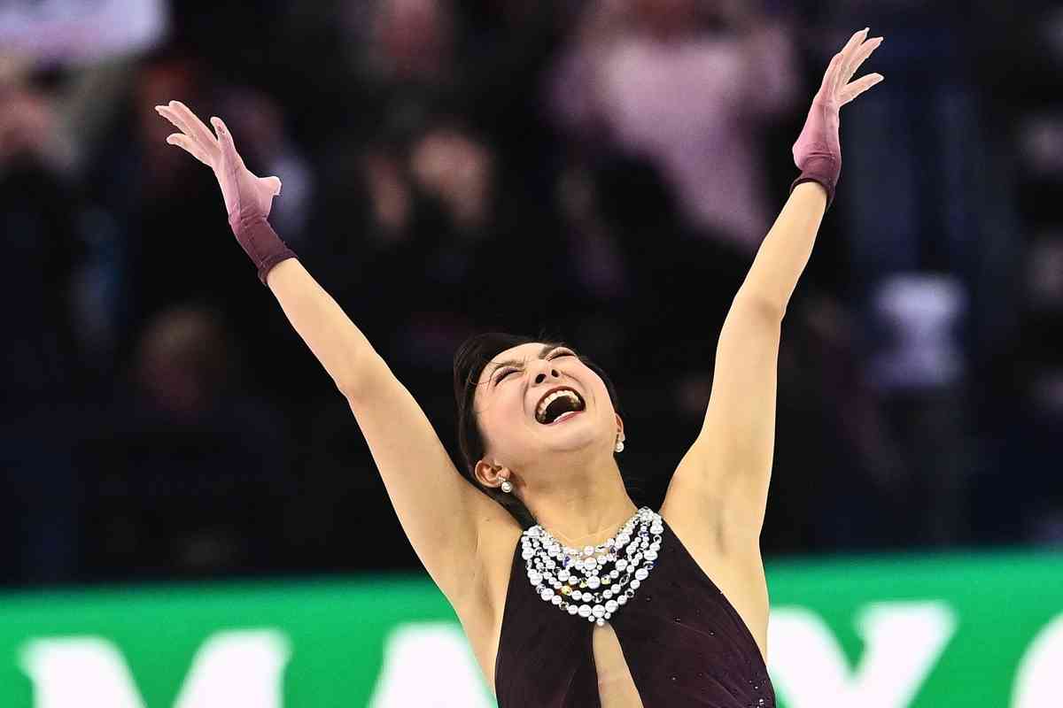 2026年3月27日,在捷克布拉格O2體育館,日本選手坂本花織在奪得女子單人滑項目冠軍後,在賽場上開心慶祝。(Michal Cizek/AFP via Getty Images)