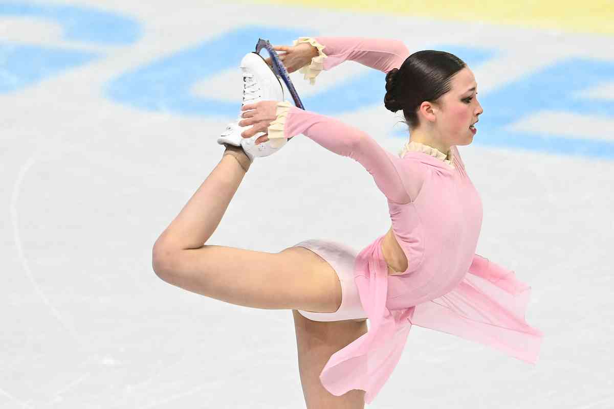 2026年3月25日,在捷克布拉格O2體育館,比利時選手平扎羅內參加女子單人滑短節目比賽。(Michal Cizek/AFP via Getty Images)