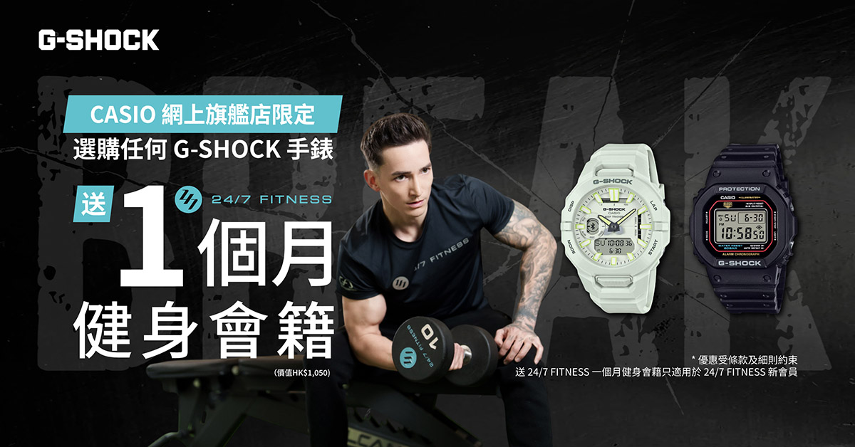 另外,G-SHOCK首度聯手全港規模最大健身品牌24/7 FITNESS。由即日起至4月30日,於CASIO授權網上旗艦店選購任何G-SHOCK手錶,即可獲贈24/7 FITNESS一個月健身會籍(價值HK$1,050)。禮品數量有限,先到先得,送完即止。