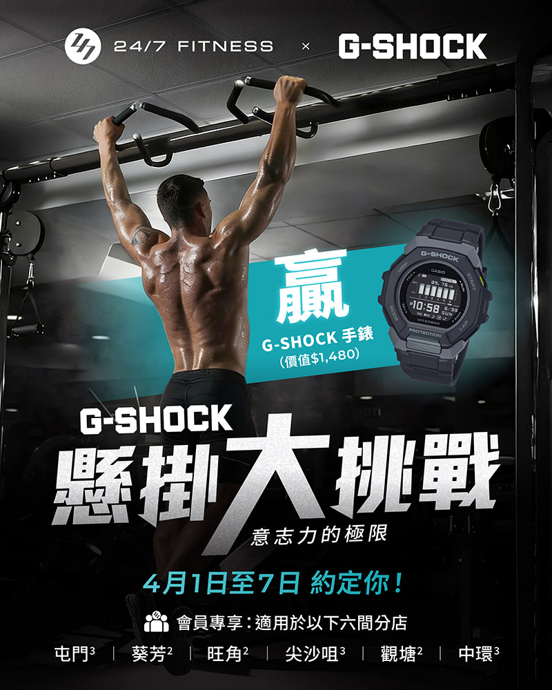 由4月1日至7日24/7 FITNESS旗下6間分店將舉行G-SHOCK「懸掛大挑戰」,參加者有機會贏取G-SHOCK手錶。活動詳情將於24/7 FITNESS社交媒體公布。