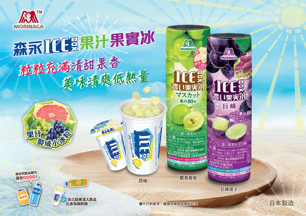 Ice Box果汁果實冰系列將果汁濃縮於碎冰之中,以細小冰粒打造爽快口感,注入高比例果汁製成。3款口味包括巨峰提子、麝香葡萄和西柚。