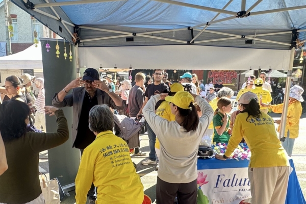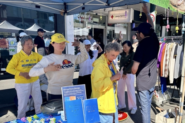 2026年3月29日,墨爾本格倫費里嘉年華(Glenferrie Festival)在霍桑區(Hawthorn)格倫費里街舉辦。圖為一名遊客(右一)在法輪大法展位學煉功法動作。(Claire Liu/大紀元)
