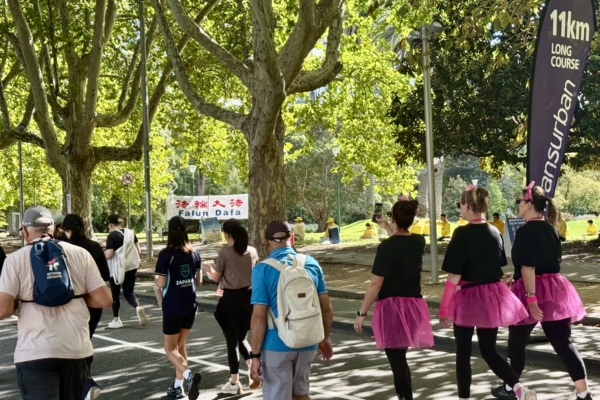 當路線進入維多利亞女王花園(Queen Victoria Gardens)附近時,選手們從高樓林立的市區街道,一下子進入樹蔭包圍的開闊綠地,身著明黃上衣的法輪大法學員正在集體煉功。不少選手在這一段放慢節奏,邊跑邊欣賞這寧靜祥和的一幕。